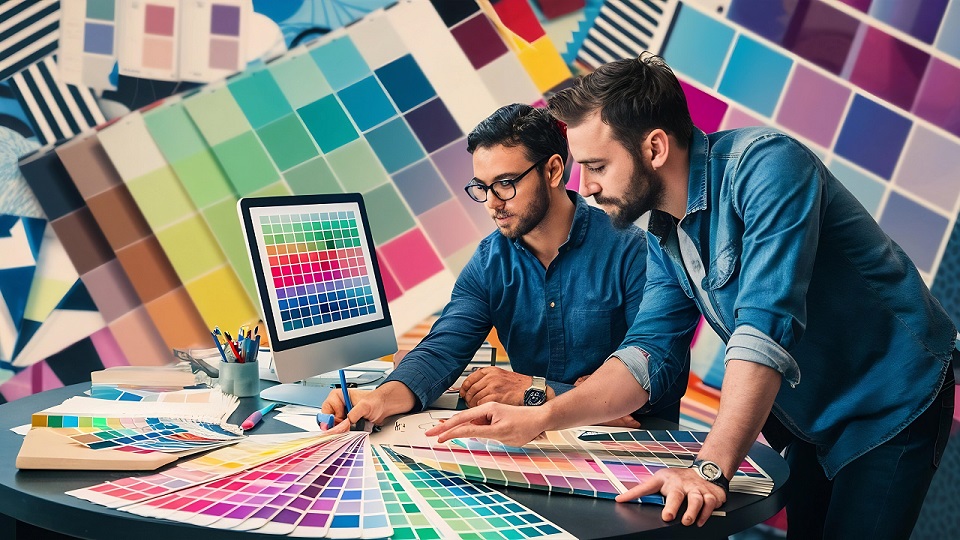 A technician in a print studio is meticulously calibrating a printer using advanced color management techniques. With an array of vibrant color charts and sophisticated tools, the technician ensures